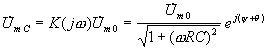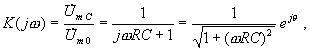 Теперь для определения частного решения u'C рассмотрим установившийся синусоидальный процесс при t ® ¥, когда свободная составляющая u"C исчезает. Для определения напряжения u'C(t) воспользуемся комплексным методом. Передаточная функция рассматриваемой цепи