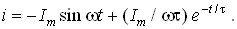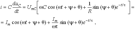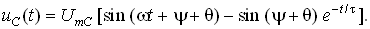 С другой стороны, влияние начальной фазы в момент включения на процесс наиболее сильно, если рассмотренный аргумент синуса y + q = p/2. В этом случае апериодическая составляющая максимальна, и выражения для uC и i после преобразования тригонометрических функций принимают вид: