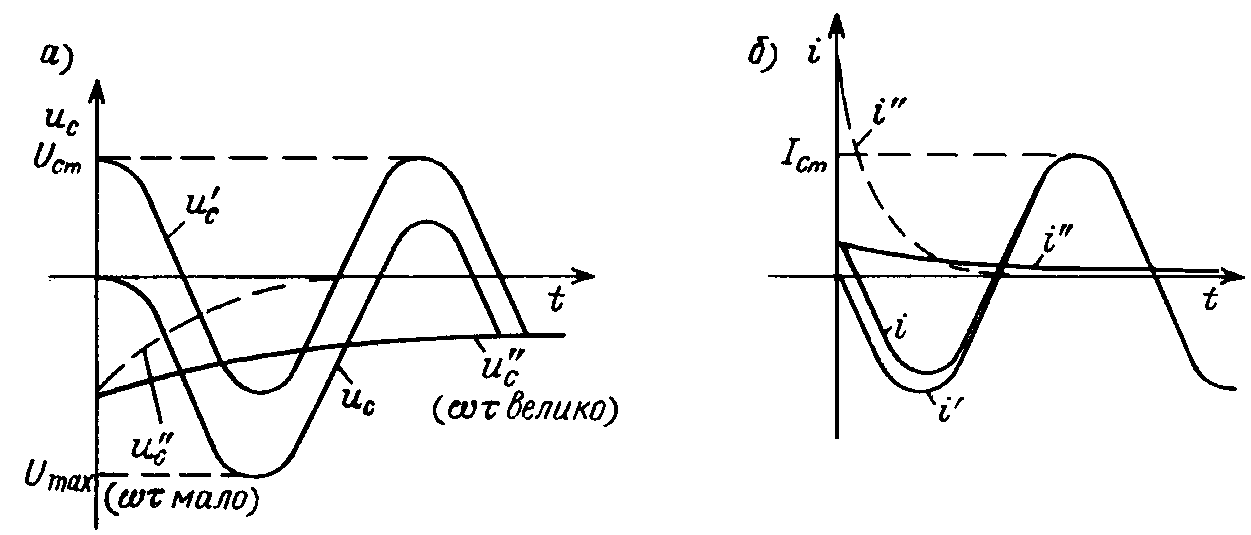 При больших wt влияние апериодической составляющей существенно в течение ряда начальных периодов процесса результирующая кривая напряжения на конденсаторе uC имеет несимметричное относительно оси абсцисс расположение экстремумов, которые постепенно приближаются к симметричной кривой u'C установившегося режима. Вследствие этого экстремальные значения этого напряжения umax в начальные периоды могут превышать амплитуду установившегося значения. Это наиболее сильно проявляется в первом полупериоде. Так, при wt = p (или t = p/w) имеем uC(p/w) = UmC(– 1 – e–p/wt), т. е. | umax |/UmC @ 1 + e–p/wt. Отсюда следует, что максимальное значение umax не может превысить амплитуду установившегося режима UmC более чем в два раза.