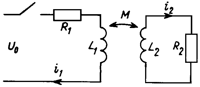 Рассмотрим переходный процесс при подключении к источнику напряжения u0 трансформатора с индуктивностями обмоток L1, L2 и взаимной индуктивностью М, вторичная обмотка которого замкнута на сопротивление R2 (рис. 17.3). |