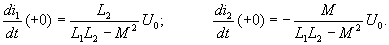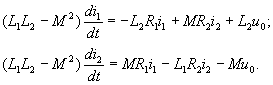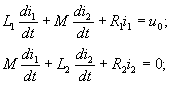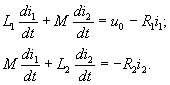 Процесс описывается уравнениями, составленными для обоих контуров относительно первичного и вторичного токов i1 и i2: