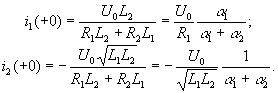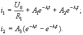 Теперь нетрудно определить выражения для токов переходного процесса, используя начальное условие и общее решение при t = 0: