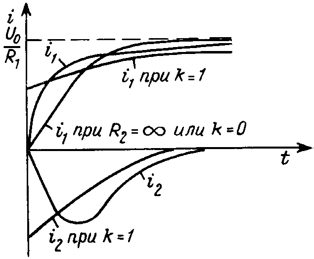 Таким образом, при идеальной связи контуров (k = 1) быстрая начальная часть переходного процесса сокращается до нуля — при t = 0 токи скачком принимают указанные начальные значения, а затем изменяются по экспоненциальному закону, приближаясь к установившимся значениям.