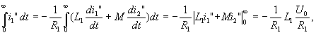 , взятый за все время переходного процесса при конечном значении R2 и R2 = ∞ одинаков и вообще не зависит от характера нагрузки трансформатора. Действительно, из первого уравнения исходной системы имеем для свободного тока i1” = – [L1(di1”/dt) + M(di2”/dt)]/R1. Поэтому рассматриваемый интеграл равен