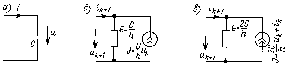 Так, применение неявного метода Эйлера к соотношению du/dt = (1/C)i, выражающему связь тока и напряжения в конденсаторе (рис. 18.2, а), приводит на k-м шаге интегрирования к разностному соотношению uk+1 – uk = (h/C)ik+1 или