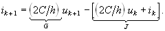 Так же можно получить резистивную схему замещения конденсатора, отвечающую интегрированию с помощью метода трапеций. В этом случае дифференциальная связь между током и напряжением аппроксимируется разностным соотношением uk+1 – uk = (h/2C)(ik + ik+1), из которого для искомого тока ik+1 найдем выражение