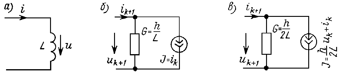 Разностная аппроксимация соотношения di/dt = (1/L)u, базирующаяся на неявном методе Эйлера, имеет вид ik+1 – ik = (h/L)uk+1, откуда получим