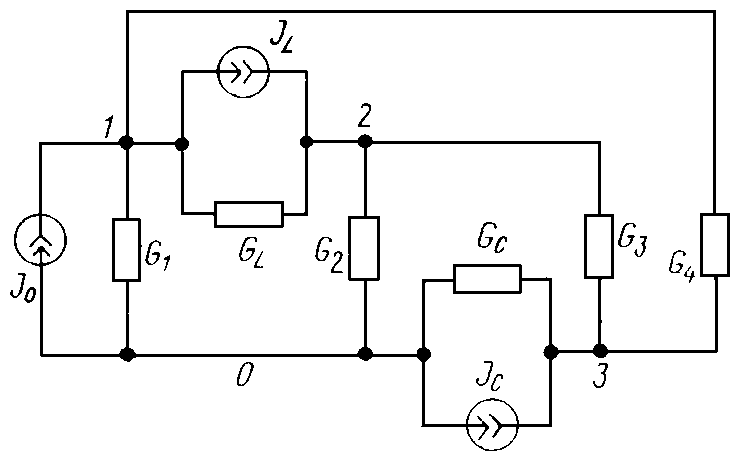 При использовании неявного метода Эйлера имеем: GL = h/L; JL = iLk; GC = C/h; JC = CuCk/h. Для расчета используем метод узловых напряжений. При указанной на рис. 18.4 нумерации узлов получаем: