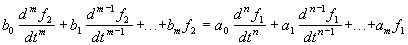 s имеет смысл оператора дифференцирования , а его степени отвечают производным высших порядков. Поэтому по известной передаточной функции можно также записать дифференциальное уравнение, определяющее закон преобразования входного сигнала f1 в выходной f2. Для записанного выше общего выражения передаточной функции это дифференциальное уравнение имеет вид