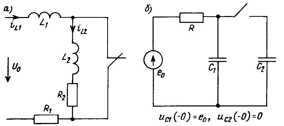 Расчет таких переходных процессов на основе дифференциальных уравнений требует определения начальных значений токов iL и напряжений uC при . Для этого можно использовать условия непрерывности суммарного потокосцепления обеих катушек
