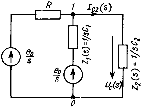 б. С учетом указанных выше начальных условий эквивалентная операторная схема цепи имеет вид, показанный на рис. 19.10. Для напряжений