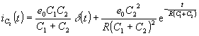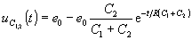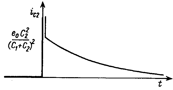 Это выражение показывает, что ток переходного процесса складывается из быстрой составляющей импульсного характера, обусловливающей мгновенную подзарядку конденсатора C2 до напряжения , и последующей медленной — экспоненциальной — составляющей, определяющей дозарядку обоих параллельно включенных конденсаторов до напряжения источника e0 (рис. 19.11).