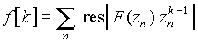 Если изображение представляет рациональную дробь F(z) = G(z)/H(z), а F(z)zk–1 имеет только простые полюса, отличные от нуля, применение правила вычисления вычетов в простых полюсах позволяет получить формулу