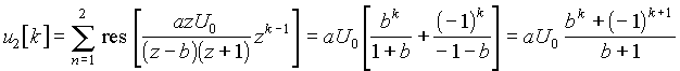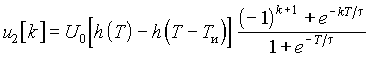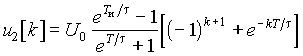 Окончательная форма оригинала u2[k] зависит от конкретного вида последовательности входных импульсов u1[k]. z-изображение знакопеременной последовательности u1[k] одинаковых по величине и чередующихся по знаку импульсов (см. рис. 20.11), описываемых выражением u1[k] = (– 1)kU0, можно получить, из формулы изображения экспоненты, приняв множитель в показателе a = jp (ea = ejp = – 1):