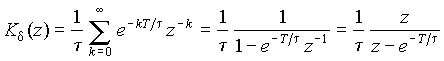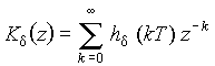 Наиболее просто определить передаточную функцию для последовательности идеализированных d-импульсов (см. рис. 20.6, б). В этом случае одиночный “тестирующий” импульс представляет собой d-функцию d(t), а реакция системы на его воздействие это импульсная характеристика цепи hd(t). Поэтому передаточная функция импульсной системы представляет z-изображение последовательности значений этой характеристики, взятых через интервалы времени Т: