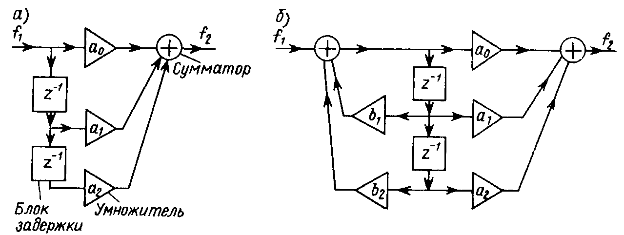 Блок-схемы цифровых фильтров обоих классов 2-го порядка, включающие перечисленные блоки, показаны на рис. 21.10 (а – нерекурсивный; б – рекурсивный).