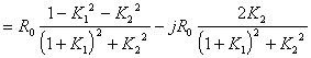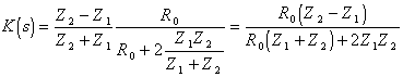 Эти выражения позволяют по заданному значению K(s) найти операторные сопротивления плеч мостового четырехполюсника. В случае если Z1(s) и Z2(s) являются положительными вещественными функциями, их реализация методами синтеза двухполюсников ведет к искомой цепи. Последнее условие выполняется, если на мнимой оси s = jw модуль передаточной функции | K(jw) | £ 1. Действительно, пусть K(jw) = K1(w) + jK2(w). В этом случае подстановка K(jw) в последнюю формулу для Z1 и преобразование приводят к результату