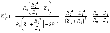 Таким образом, Z1(s) будет положительной функцией лишь при условии 1 ³ K12 + K22 = K2, или | K(jw) | £ 1.