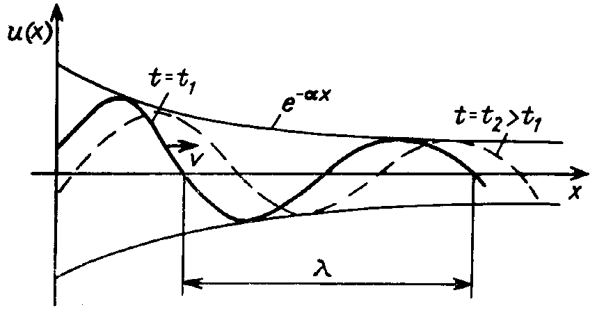 По мере распространения волны ее амплитуда затухает по экспоненциальному закону, что связано с наличием потерь энергии в линии.