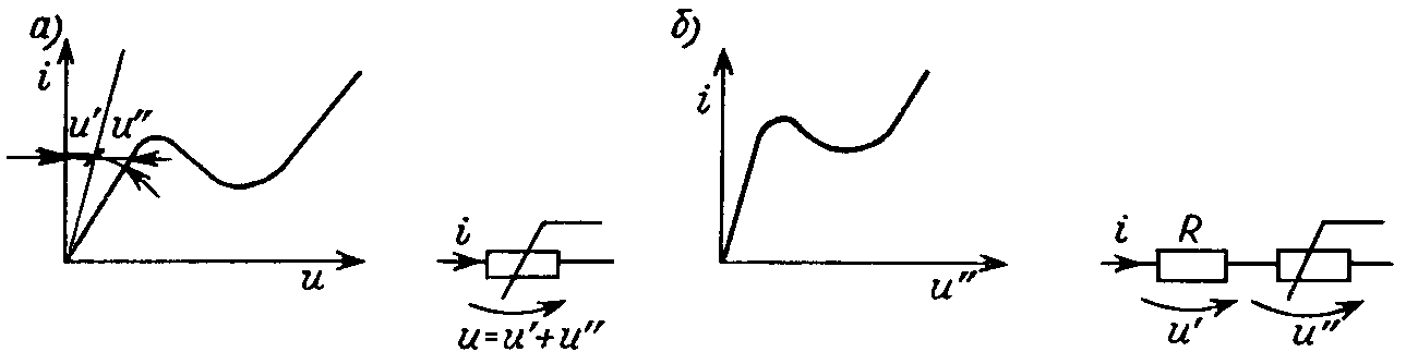 Система уравнений нелинейной резистивной цепи включает нелинейные компонентные уравнения и линейные уравнения, выражающие законы Кирхгофа для сечений и контуров цепи. Получение однозначного решения системы требует представления немонотонных характеристик, управляемых током, в форме u(i), и характеристик элементов, управляемых напряжением, в форме i(u). Однозначность топологических уравнений, связанная с их линейной независимостью, достигается выделением дерева цепи и записи уравнений первого закона Кирхгофа для его главных сечений и уравнений второго закона для главных контуров. Если в составляемой системе целесообразно сохранить управляющие величины элементов с немонотонными характеристиками, то управляемые напряжением резисторы следует включить в дерево, ветви которого описываются напряжениями, а резисторы, управляемые током, отнести к связям. В случаях, когда это условие выполнить не удается (в цепи существуют контуры из элементов, управляемых напряжением, и сечения из элементов, управляемых током), можно использовать следующий искусственный прием. Элемент с характеристикой, управляемой напряжением (рис. 28.1, а), представляется в виде последовательного соединения линейного резистора с сопротивлением R = u'/i и нелинейного резистора с характеристикой i(u") = i(u – Ri) (рис. 28.1, б). Это позволяет исключить контур из элементов, управляемых напряжением, так как введенный линейный резистор R может быть отнесен к связям.