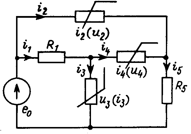 Рассмотрим пример формирования уравнений цепи, включающей два линейных и три нелинейных резистора (рис. 28.2).