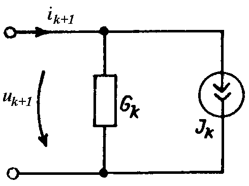 Таким образом, дискретная линеаризованная схема рассматриваемого элемента включает параллельно соединенные проводимости Gk = di/du(uk) и источник тока Jk = ik – Gkuk (рис. 28.4), параметры которых находят по значениям тока и напряжения на элементе (ik и uk), полученным на k-й итерации в результате расчета всей цепи.