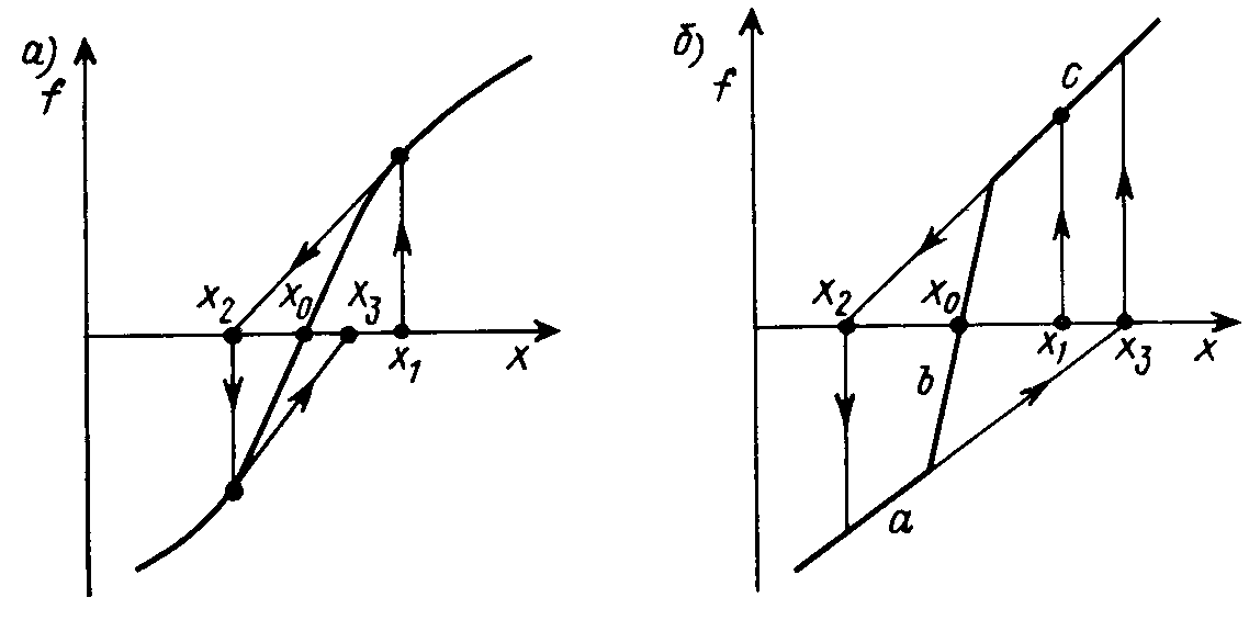 Однако при кусочно-линейной аппроксимации возможно зацикливание итерационного процесса. Поясним это на примере решения одного нелинейного уравнения f(x) = 0. Графическая иллюстрация применения метода Ньютона в окрестности решения x = x0 и соответственно дискретных линеаризованных схем приведена на рис. 28.6, а,б. При кусочно-линейной аппроксимации функции f(x) (рис. 28.6, б) постоянство производных f '(x) на отрезках ломаной a и c приводит к тому, что процесс итераций зацикливается на значениях x2 и x3, и его сходимость к решению теряется. В то же время применение метода Ньютона к исходной задаче с нелинеаризованной функцией f(x) приводит к искомому решению (рис. 28.6, а).