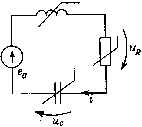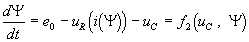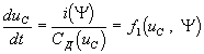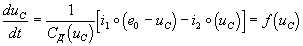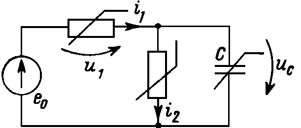 Для главного сечения, включающего емкость, запишем dq/dt = CД duC/dt = i(Ψ). Главный контур дает единственное уравнение второго закона Кирхгофа dΨ/dt = e0 – uR(i) – uC. Перепишем оба уравнения в нормальной форме: