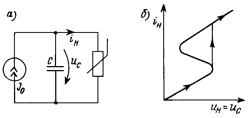 Переменные состояния. Напомним, что в линейной цепи переменные состояния iL и uC однозначно определяют токи и напряжения всех остальных ветвей. Нетрудно установить, что в нелинейной цепи с неоднозначными (немонотонными) характеристиками элементов такой однозначности может не быть. Рассмотрим в качестве примера простую цепь, состоящую из конденсатора с параллельно включенным нелинейным резистором (рис. 29.3, а). Пусть нелинейный элемент имеет характеристику uн(iн), управляемую током (рис. 29.3, б). Уравнение цепи J0 = C duC/dt + iн содержит две переменные: uC и ток нелинейного резистора iн. Напряжение uC нельзя принять за переменную состояния, так как оно не определяет однозначно ток iн. Так как при заряде конденсатора наблюдается скачок тока iн и его производная diн/dt в момент скачка бесконечна, то использование переменной iн в качестве переменной состояния также невозможно. Таким образом, динамические процессы в цепях с контурами из конденсаторов и управляемых током нелинейных резисторов нельзя описывать переменными состояния. Согласно принципу дуальности, аналогично в цепях, включающих сечения из катушек индуктивности и управляемых напряжением резисторов, также нельзя пользоваться уравнениями состояния. Простейшая такая цепь это последовательное соединение катушки и резистора с N-образной характеристикой (например, туннельного диода). Для такой цепи характерны скачки напряжения при динамических процессах.