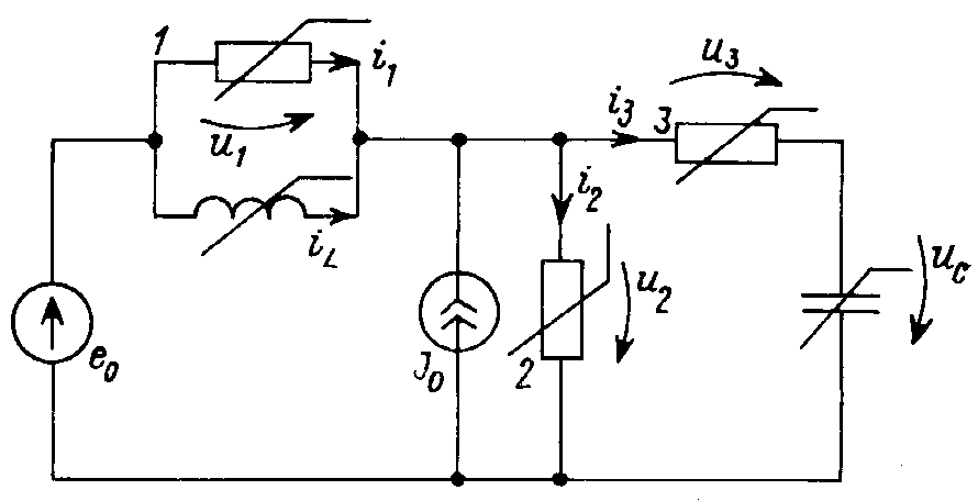 Однако, такая возможность существует не всегда. Покажем это на примере более сложной цепи, включающей нелинейные катушку и конденсатор и три резистивных элемента (рис. 29.6). Описать цепь с помощью переменных состояния iL (или Ψ) и uC (или q) можно при отсутствии особых контуров и сечений. Наличие контуров, включающих источник ЭДС, конденсатор и замыкающиеся через резисторы 1, 2; 2, 3 или 1, 3, показывает, что в цепи, описываемой уравнениями состояния, лишь один из резисторов может иметь характеристику, управляемую током. Так как элементы L, J0 и все три резистора образуют сечение, то для искомого описания цепи необходимо, чтобы хотя бы один резистор управлялся током. Таким образом, рассматриваемая цепь допускает описание с помощью уравнений состояния лишь в случаях, когда один из резисторов цепи управляется током, а остальные два — напряжением. Рассмотрим вариант, в котором характеристики резисторов заданы в виде i1(u1), u2(i2), i3(u3).