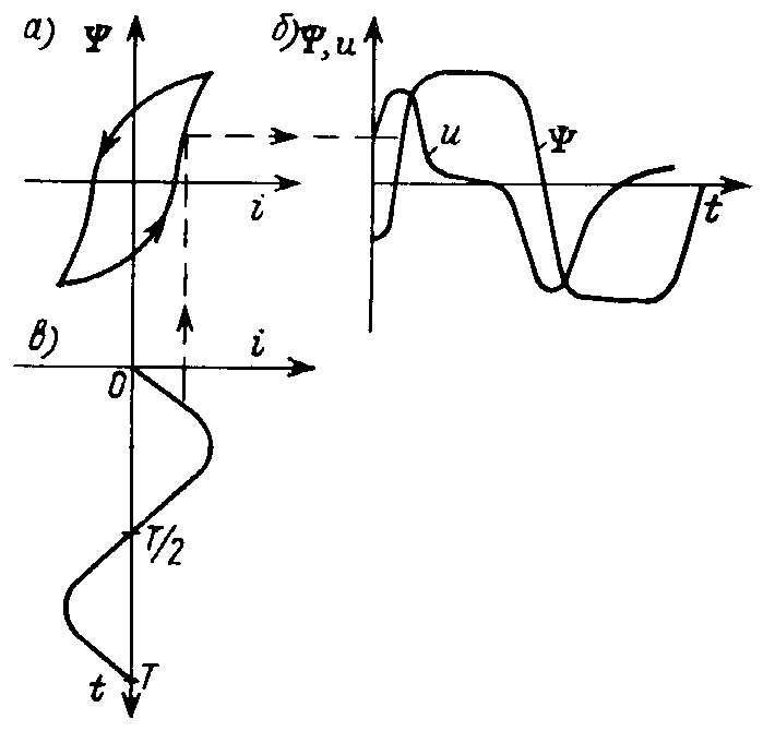 а) определяет несинусоидальный характер тока в катушке при ее питании от источника синусоидального напряжения. В этом режиме из соотношения