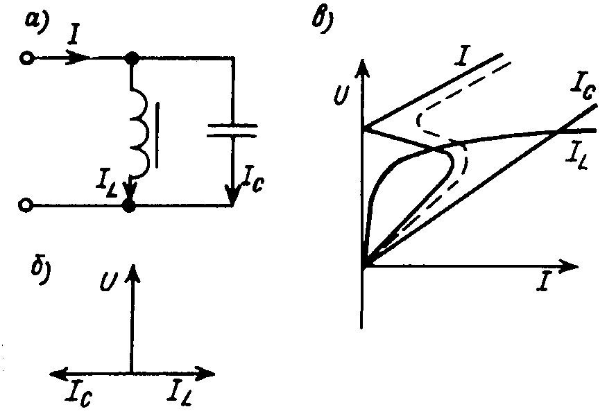 Феррорезонанс в контуре с параллельным соединением. Анализ процессов в контуре (рис. 29.15, а) при тех же допущениях об отсутствии потерь в катушке и замене несинусоидальных кривых эквивалентными синусоидами производится аналогично. При равенстве напряжений на элементах цепи токи в обеих ветвях находятся в противофазе (рис. 29.15, б), и результирующая вольтамперная характеристика цепи
