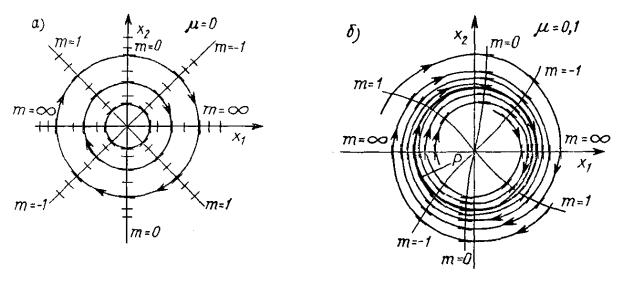 При m = 0 — в линейной цепи без затухания — изоклины являются прямыми, выходящими из начала координат (рис. 30.14, а), а фазовые траектории имеют вид концентрических эллипсов. Эти траектории замкнуты, что определяет автоколебательный гармонический режим в линейной цепи. Амплитуда незатухающих колебаний определяется начальными условиями и не зависит от свойств цепи.