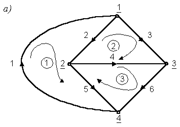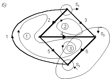 Задача 1.1. Составить уравнения Кирхгофа для мостовой цепи, направленный граф которой изображен на рис. П1.1, а. |