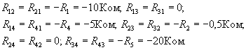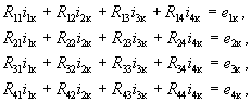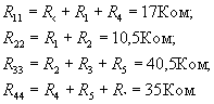 Решение системы дает следующие значения контурных токов: i1к = 8,6× 10–2 (мА); i2к = 8,56× 10–2 (мА); i3к = 8,08× 10–2 (мА); i4к = – 7,88× 10–2 (мА). Далее по указанному выше правилу определяем входной и нагрузочный токи: