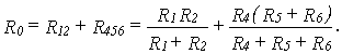 Так как при закорачивании ветви с резистором R3 конфигурация цепи существенно не упрощается, то воспользуемся способом непосредственного расчета внутреннего сопротивления источника R0. Для этого исключим оба независимых источника (рис. П4.3). Входное сопротивление этой цепи относительно зажимов аb равно сумме сопротивлений ее части R12 с параллельным соединением R1 и R2 и второй части R456, представляющей параллельное соединение R4 с последовательно включенными сопротивлениями R5 и R6: