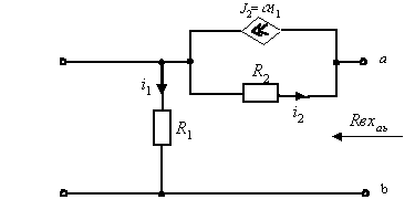 Это позволяет определить и внутреннее сопротивление источника как R0 = e0/J0 = R2(1 - a + R1/R2) = R1 + R2(1 - a) кОм. Покажем, что тот же результат получится при анализе режима в цепи с исключенным источником J1 (рис. П4.9). В рассматриваемой цепи uab = - i2R2 + i1R1. Поскольку из первого закона Кирхгофа i2= - i1+ ai1= - i1(1 - a), то напряжение uab, и входное сопротивление относительно выделенных зажимов Rвх ab = uab/i1 = R1 + R2(1 - a).