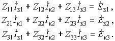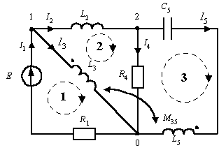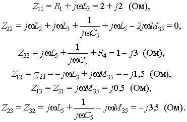 Наличие индуктивной связи между катушками L3 и L5 учитывается в собственных и общих сопротивлениях контуров следующим образом: в сопротивление Z22 войдет составляющая j2wM35, поскольку обе индуктивно связанные катушки L3, L5 входят во второй контур. Составляющая j2wM35 войдет в Z22 со знаком “минус”, так как ток ориентирован относительно маркированных зажимов катушек L3 и L5 по-разному. В общие сопротивления Z12 = Z21, Z13 = Z31, Z23 = Z32 составляющая jwM35 входит, поскольку контур из любой их пары (1 – 2, 1 – 3, 2 – 3) содержит катушку, индуктивно связанную с катушкой, принадлежащей другому контуру этой пары.