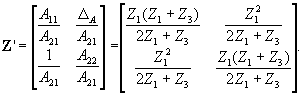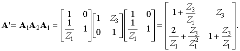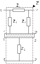Четырехполюсник Z ' — это каскадное соединение одноэлементных четырехполюсников — параллельного Z1, последовательного Z3 и параллельного Z1. A-матрицы этих четырехполюсников можно получить из результата предыдущей задачи, полагая в нем Z2 = 0 для параллельного четырехполюсника и Z1 = ∞ для последовательного и соответственно изменяя обозначения. Перемножение A-матриц дает:
