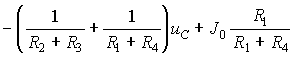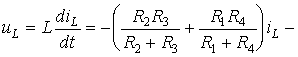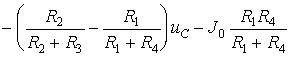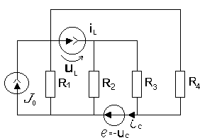 Анализ отдельных частных режимов работы этой цепи приводит к очень простым результатам. Так, при действии источника J = iL (и закороченном источнике e = - uC и разомкнутом J0) резисторы R2 и R3 соединены параллельно, так же, как и пара R1, R4, а между собой эти две пары резисторов включены последовательно. При действии только ЭДС e = - uC (J = iL и J0 разомкнуты) имеем последовательно включенные R2 и R3 и параллельно с ними — последовательное соединение R1 и R4. При закороченном источнике e = - uC и разомкнутом J = iL ток источника J0 разветвляется между параллельно включенными R1 и R4, а R2 и R3 в этом частном режиме закорочены. Для приведения полученной системы к нормальному виду уравнений состояния достаточно разделить оба уравнения на L и C.