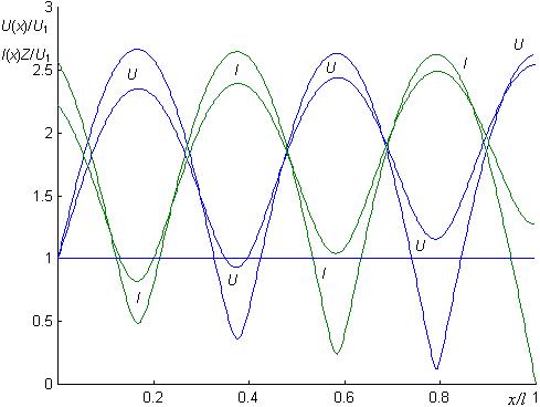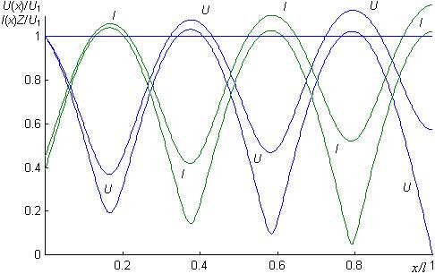 Отсюда следует U1 = U2 = 10 В — для линии без потерь при согласованной нагрузке действующие напряжение и ток неизменны по всей линии, I2 = U2/Z = 0,133 А.
