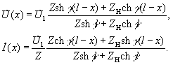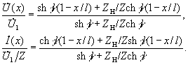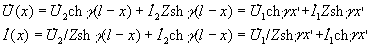 Распределение напряжения и тока вдоль линии выражается через напряжения и токи в начале и конце линии U1 и I1, U2 и I2 соотношениями