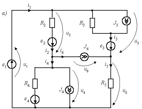 Задача 1.2. Составить систему уравнений Кирхгофа для цепи, изображенной на рис. П1.2, включающей вырожденные ветви с идеальным источником ЭДС e1 и идеальным источником тока J6.