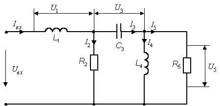 Задача 6.2. Построив векторную диаграмму, определить действующие значения входного напряжения и тока для цепи, схема которой изображена на рис. П6.1 при числовых данных: U1 = U3 = 20 В, U5 = 10 В, I2 = 1 А, I4 = I5 = 2 А;