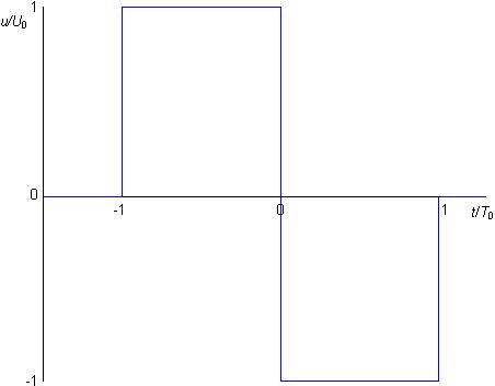 Задача 10.2. Непериодический сигнал, состоящий из двух прямоугольных импульсов напряжения противоположной полярности ± U0 и одинаковой длительности T0 (рис.П10.2,а) подается на вход цепи (рис.П10.2, б), параметры которой L/T0 = 0,1 Ом и R = 5 Ом.