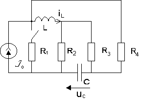 Задача 14.1. Рассчитать переходный процесс в цепи, изображенной на рис. П14.1, при следующих численных значениях параметров: R1 = 300 Ом; R2 = R4 = 200 Ом; R3 = 400 Ом; L = 0,1 Гн; C = 10 мкФ; J0 = 210 мА.