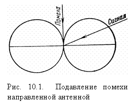 В реальных условиях (особенно это свойственно диапазону декаметровых волн) на входе приемника может действовать смесь сигналов от нескольких посторонних радиостанций, работающих на частоте полезного передатчика. Мерой борьбы с помехами этого вида является использование направленных приемных антенн с управляемой диаграммой направленности, которые позволяют в ряде случаев отстроиться от помехи, направление которой не совпадает с направлением прихода полезного сигнала (рис. 10.1). Часто эффективным средством для уменьшения действия помехи является смена рабочей частоты.