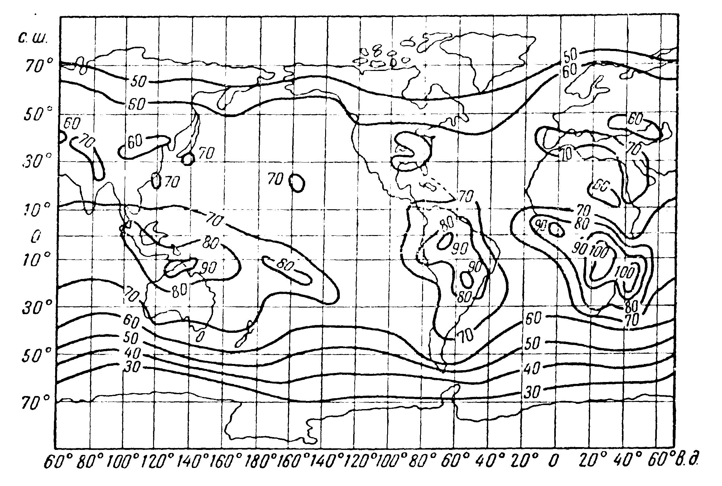 На картах нанесены линии равных значений (изоплеты) мощности атмосферных помех в дБ по отношению к величине kТВ, где k = 1,38 · 10-23 Дж/град – постоянная Больцмана, В – эффективная полоса пропускания приемника в Гц, Т – абсолютная температура приемной антенны. При построении карт эта величина принята равной 288°К. Величина kТВ определяет мощность собственных шумов на входе приемника: