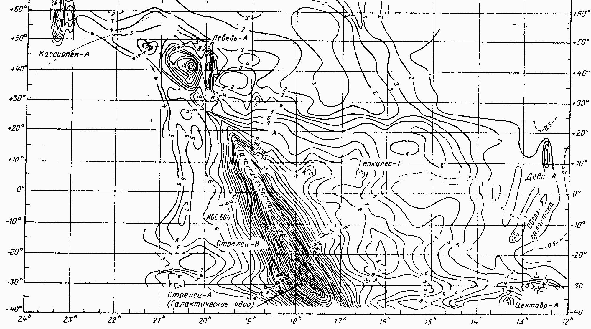 Распределение источников космического излучения в настоящее время хорошо изучено. Составлены карты интенсивности космического излучения небесной сферы. На рис. 10.4 приведена карта интенсивности излучения небесной сферы в проекции Меркатора (проекция небесной сферы на равномерную прямоугольную координатную сетку).