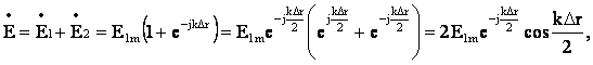 Поле излучения системы из двух связанных вибраторов является результатом сложения их полей в соответствии с их фазами и амплитудами. Рассмотрим систему из двух вибраторов, питаемых токами одинаковой амплитуды (рис. 13.3). Для простоты положим фазу поля в точке приема, создаваемого первым вибратором, равной нулю, с той же целью предположим равенство амплитуд полей обоих вибраторов Е1m ≈ E2m , что принципиально не повлияет на решение задачи. Тогда